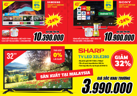 Chào mừng thành viên thứ 8, PowMarket sập giá cho toàn bộ TV tặng thêm quà đến 14.990.000đ. Một số model TV giảm sốc đợt này có thể kể đến: Smart TV Samsung 43’’ 43M5500 giảm 24% giá sau trừ khuyến mại chỉ 10.390.000đ; Smart TV Sony 43’’ 43W750E giảm 24% giá sau trừ quà còn 10.900.000đ; TV LED 32’’ Sharp 32LE280 giảm 32% còn 3.990.000đ…