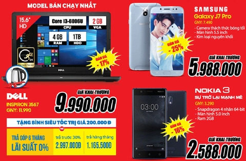 Sôi động chào hè 2018, loạt sản phẩm công nghệ có mức giá bán khai trương cực kỳ hấp dẫn: Samsung J7 Pro giảm 23% giá chỉ 5.988.000đ, Samsung J2 Pro giảm 23% giá chỉ 2.988.000đ, Nokia 3 trở lại mạnh mẽ với giá siêu sốc 2.588.000đ, laptop Dell Inspiron 3567 giảm 17% giá khai trương 9.990.000đ tặng bình siêu tốc trị giá 200.000đ, pin tích điện Remax Proda Lovely 12.000mAH giảm 49% còn 199.000đ, tai nghe nhét tai Kanen chỉ 39.000đ…